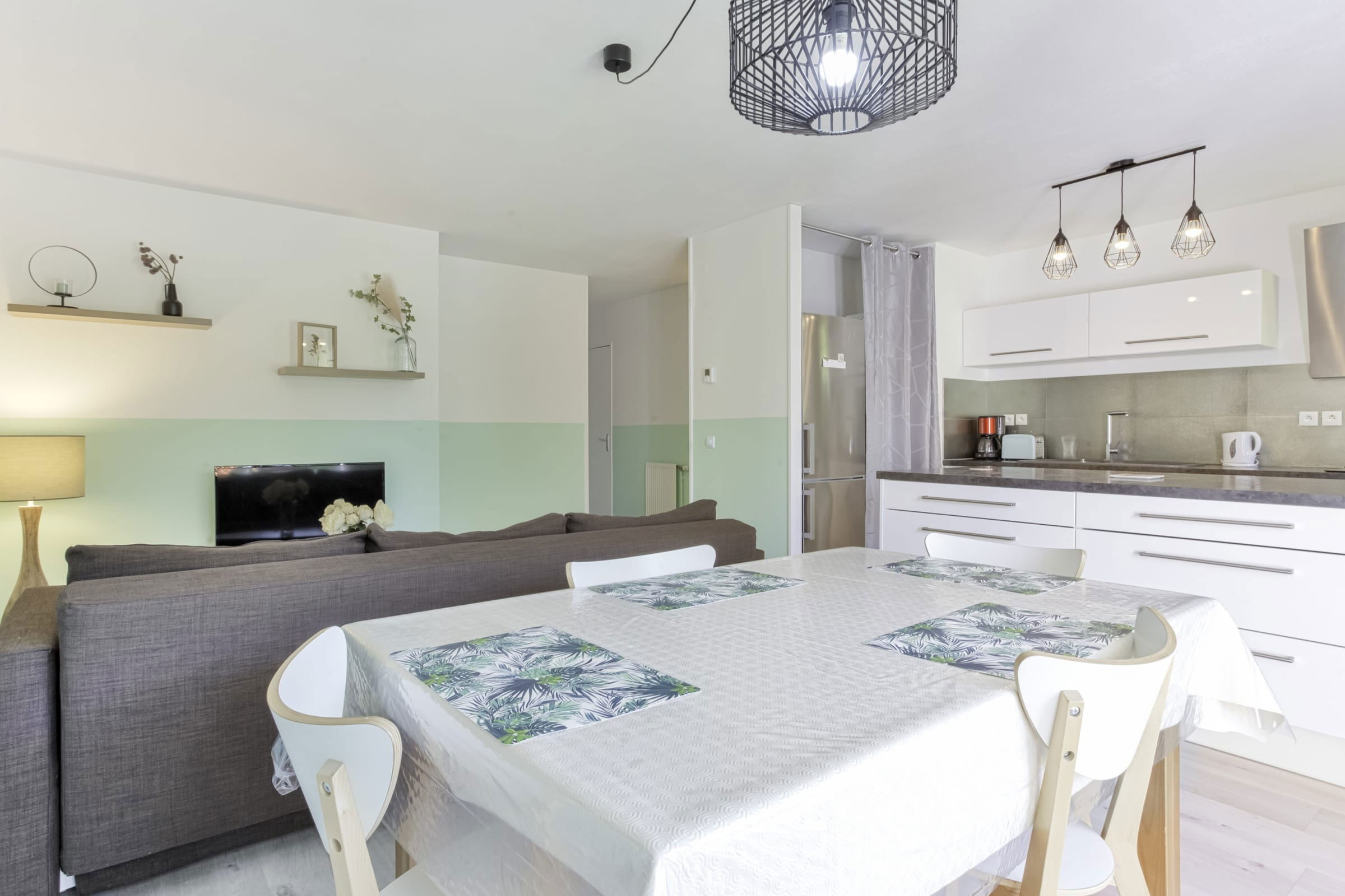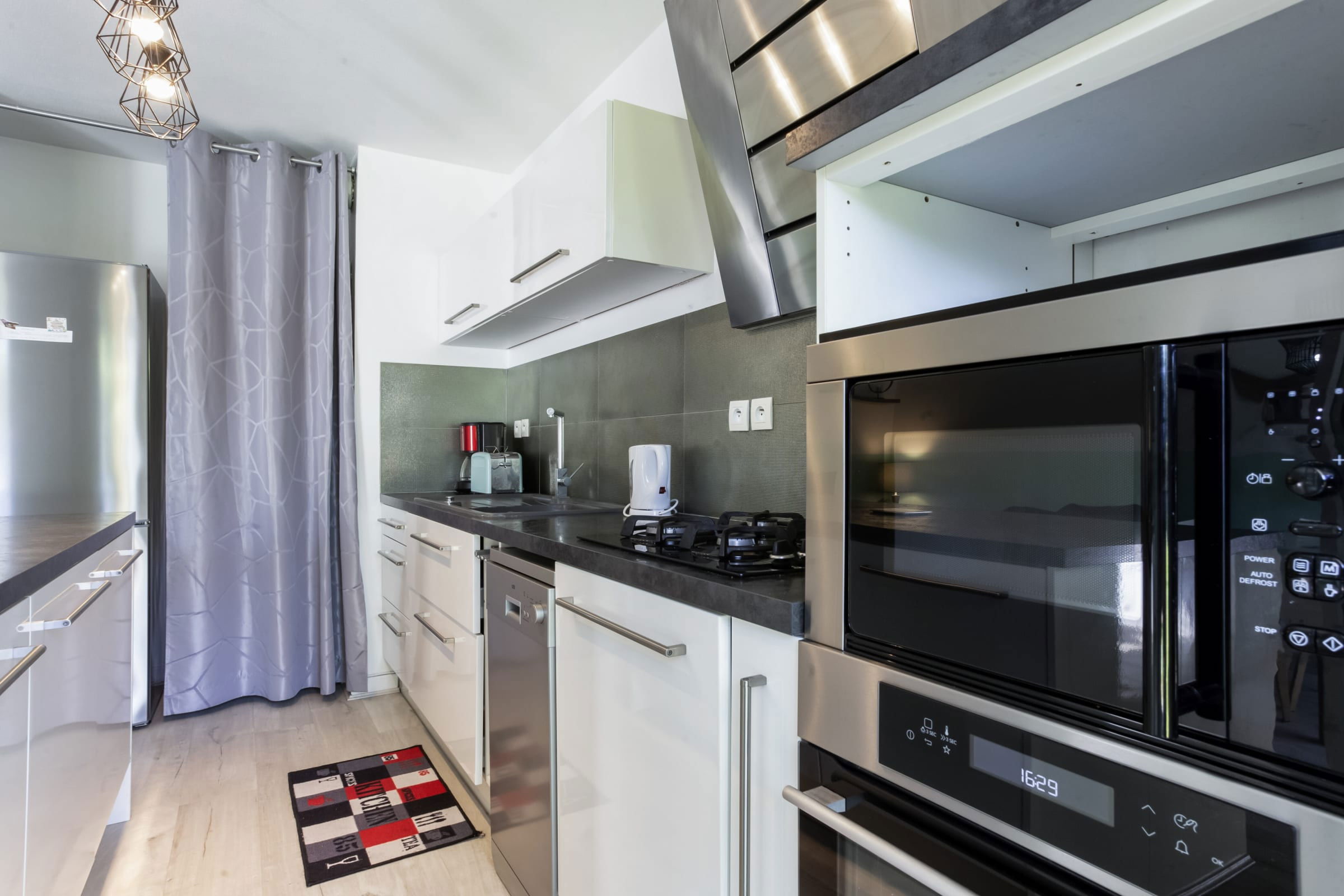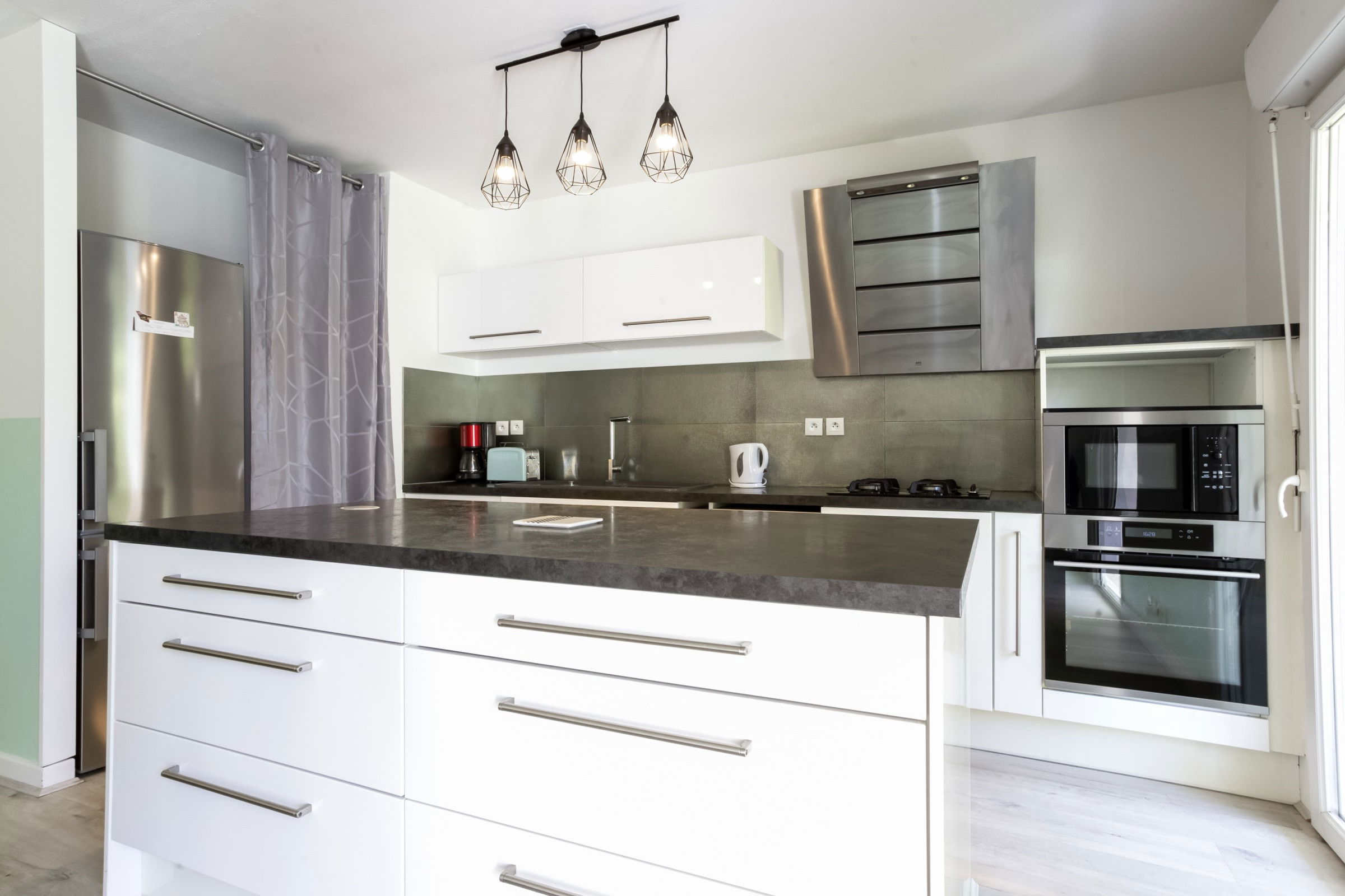 - une cuisine ouverte et très bien équipée (machine à café, mixeur, bouilloire, four, micro-ondes, plaques de cuisson, lave-vaisselle, réfrigérateur, congélateur),