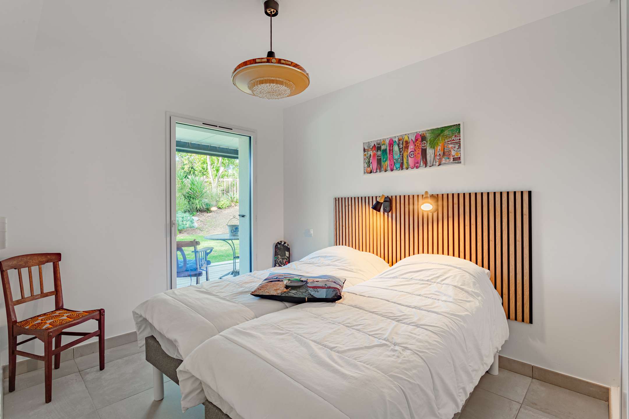 Le coin nuit offre 2 chambres avec deux grand lit avec accès direct sur la terrasse, ainsi qu'une chambre avec deux petits lits superposés et deux salles d'eau.