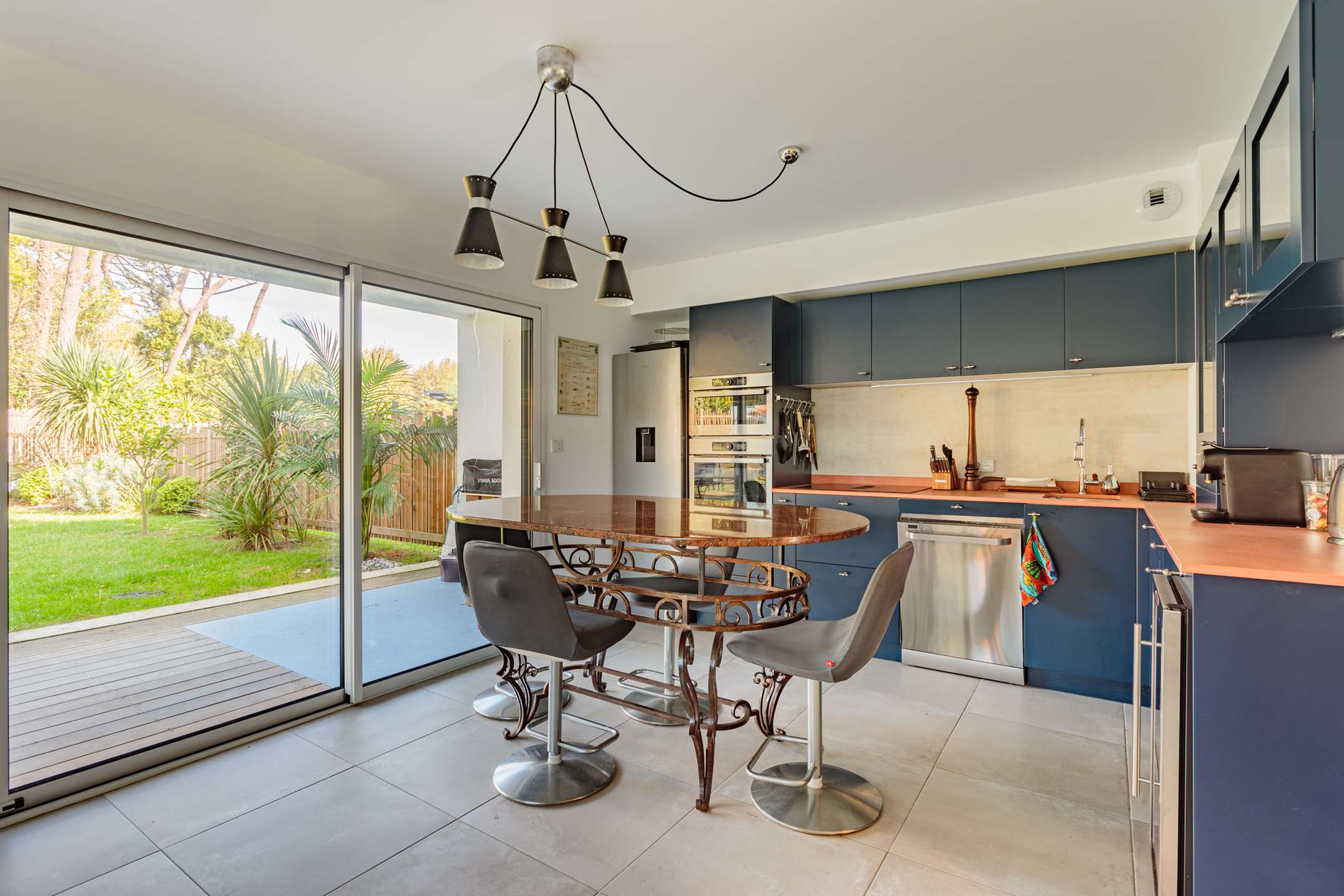 Il dispose d'une grande pièce à vivre lumineuse avec coin salon et salle à manger, ainsi que d'une cuisine ouverte équipée avec un accès direct sur la terrasse et le jardin.
