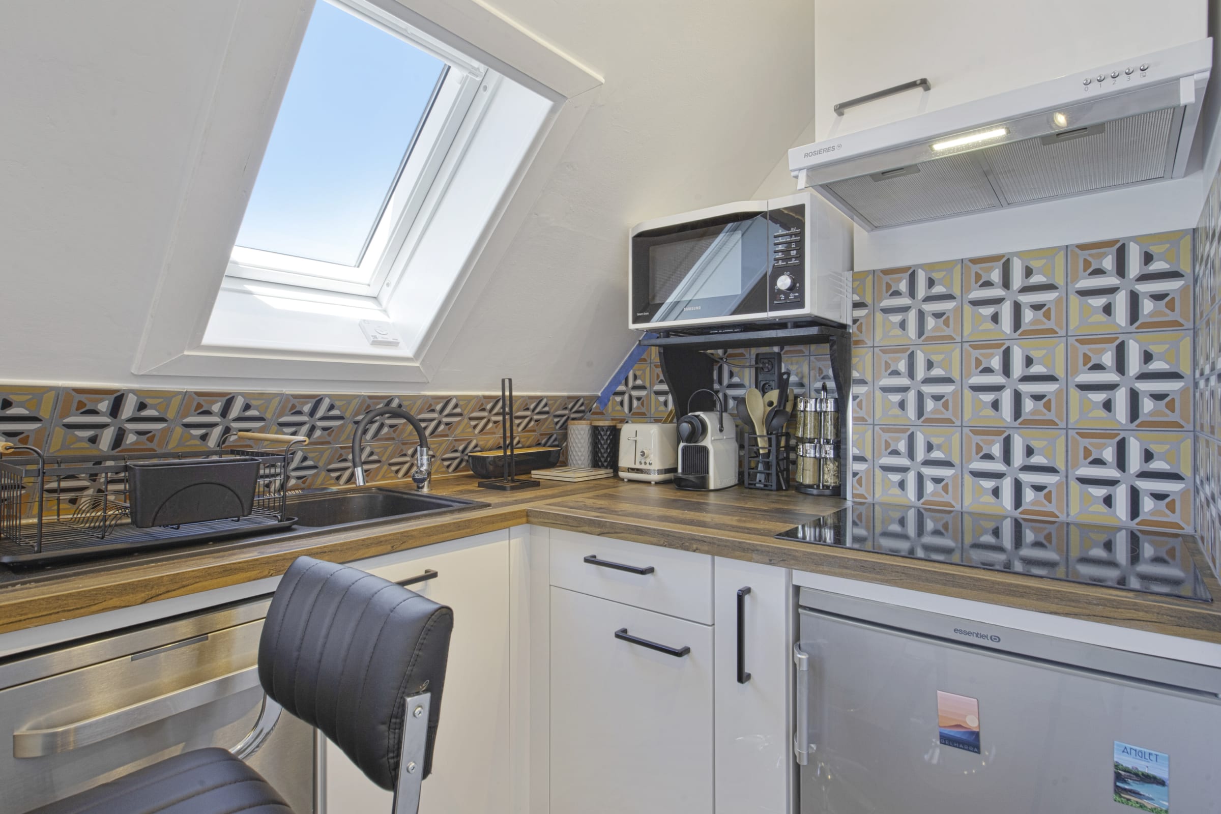 - une cuisine ouverte parfaitement équipée (machine à café, grille-pain, bouilloire, four micro-ondes, plaques de cuisson, lave-vaisselle, réfrigérateur, congélateur),